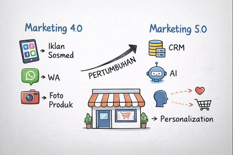 Untuk UMKM kecil-menengah (omzet 50-200 juta/bulan) dengan 20-50 pelanggan per hari, hybrid adalah jawaban. Terapkan 4.0 sebagai fondasi, lalu tambahkan satu aspek 5.0 seperti broadcast WA personal atau loyalty program sederhana.